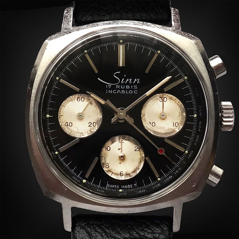 Scew-Back case and black dial with three white subdials. Counter 30-minute and 12-hour subdials at 3 and 6 o'clock, the permanent seconds subdial at 9 o'clock.